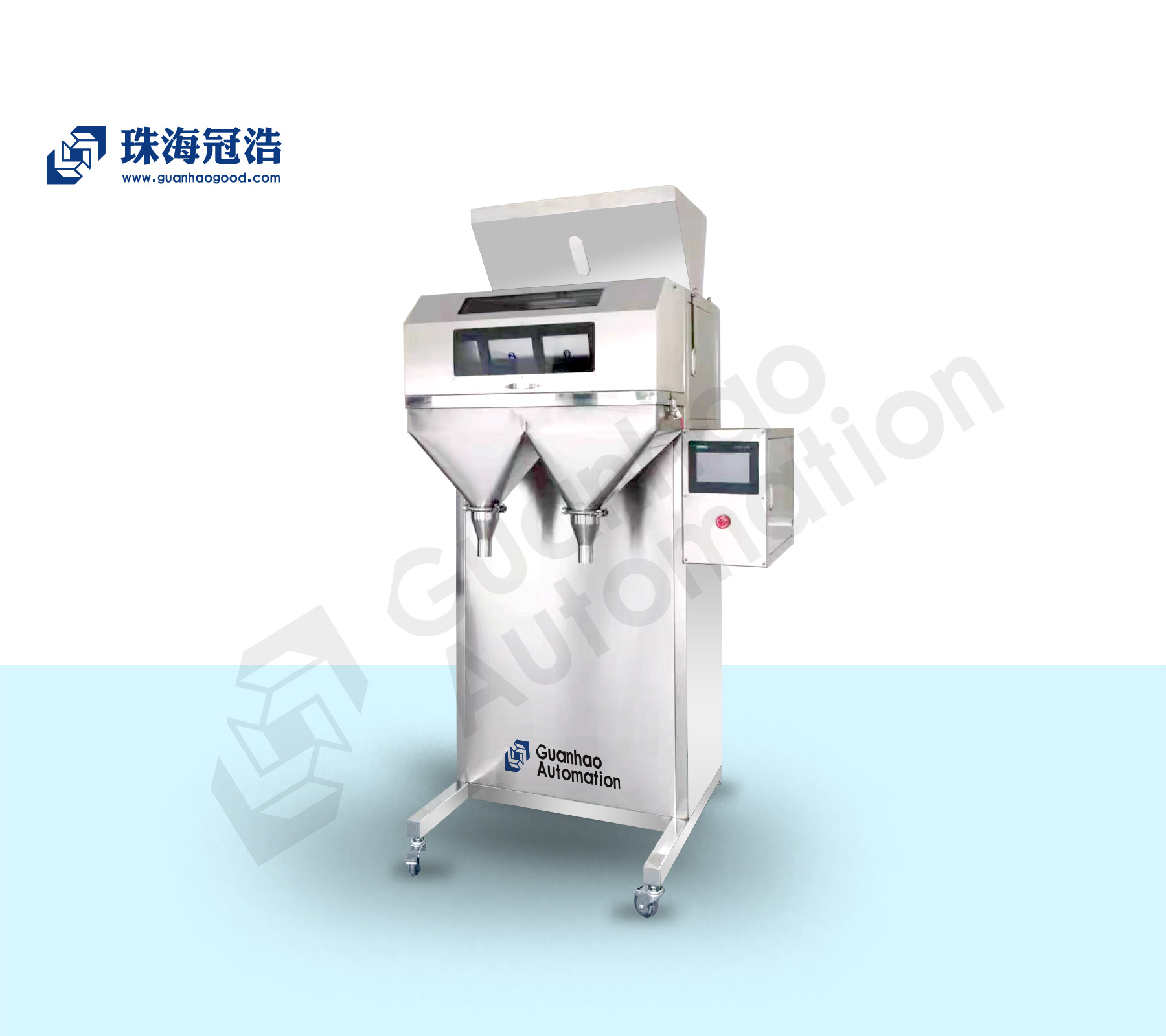1.PLC控制,中文觸摸屏操作,只需輸入重量參數,系統可自動計算快加值、慢加值,可對誤差值自動跟蹤修正。